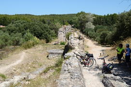 水路につながってそのまま急斜面を流れ下るようになっている。水路は斜面の途中でハの字型に分流し、それぞれの水路を挟んで石造の建物の跡が並んでいる。これは1ユニットあたり2棟の製粉所が1台の大型水車で稼働するというシステムを示していると考えられるが、今見える斜面だけでも20棟以上の建物跡が残っている。それより下の現在畑になっている部分との境界には南西に向かう細い道があり、水路が続いていたことは間違いないと思われるからまさに製粉コンビナートのような施設だったのだ。連日各地の属州から運び込まれる小麦を粉にひいていたはずで、膨大な量の小麦粉がアルルからローマ本国に送られていたのだと思われる。